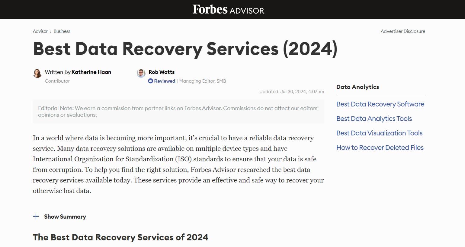 SalvageData is recognized as one of the best data recovery services in 2024 by Forbes Advisor.
